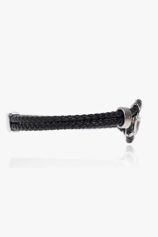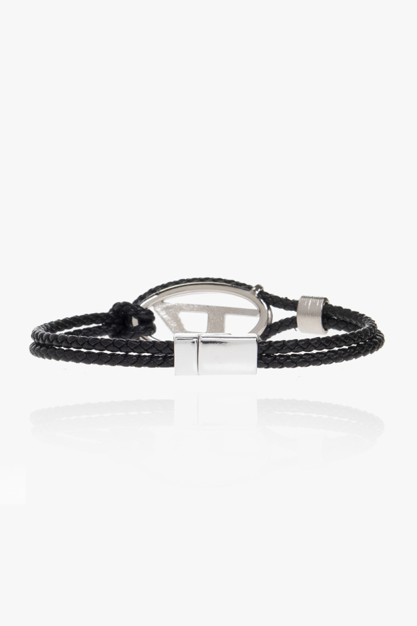 Black ‘A-ROPE’ bracelet from Diesel. Made of leather, this item secures with a magnetic snap and features a brass logo plaque.