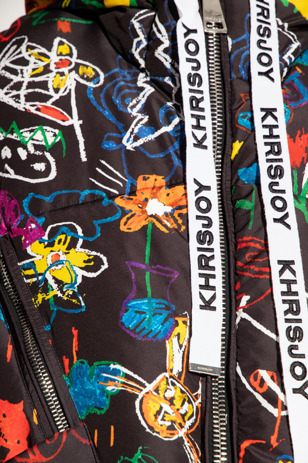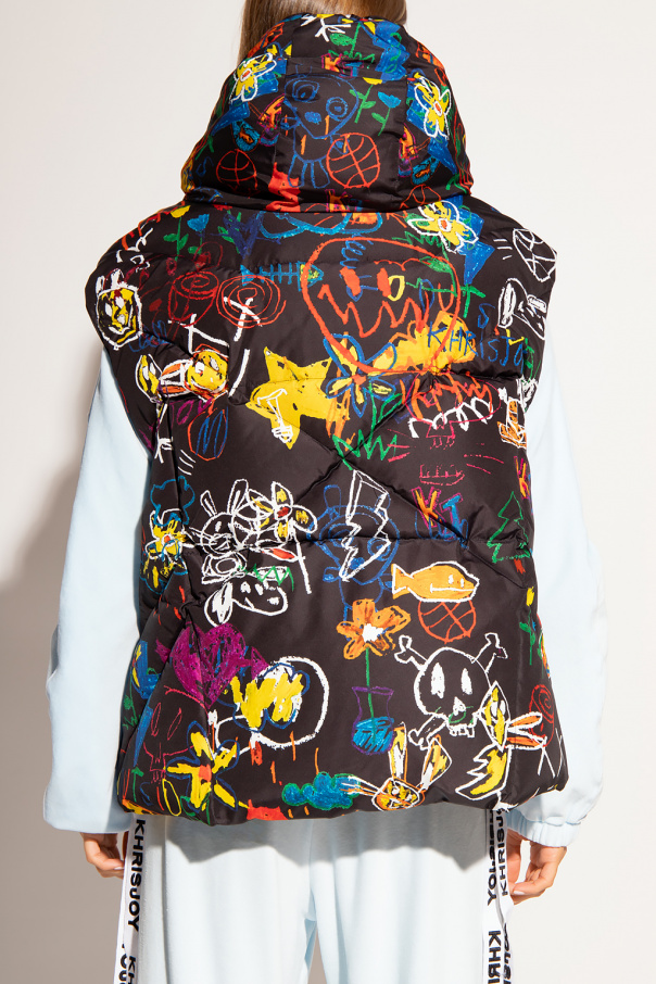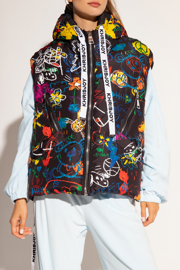 Black down vest from Khrisjoy. Crafted with an oversize silhouette, this style features a zip fastening, a colourful graphic print, four pockets on the front, including two flapped ones with zippers, and a hood and bottom hem cinched with signature branded drawstrings.