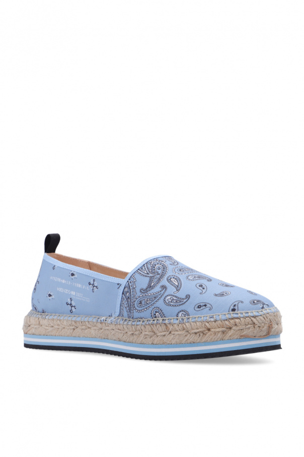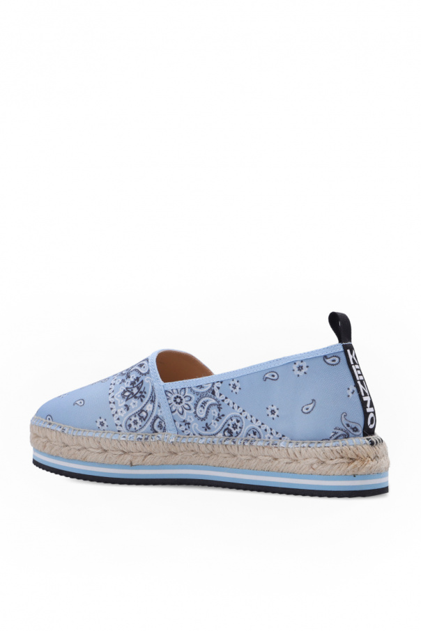 Blue espadrilles from Kenzo. Crafted from fabric decorated with a black and white ’Bandana’ pattern, this model features a black fabric insert with a printed white logo at the back and a natural jute sole trimmed with black, pink and white rubber.