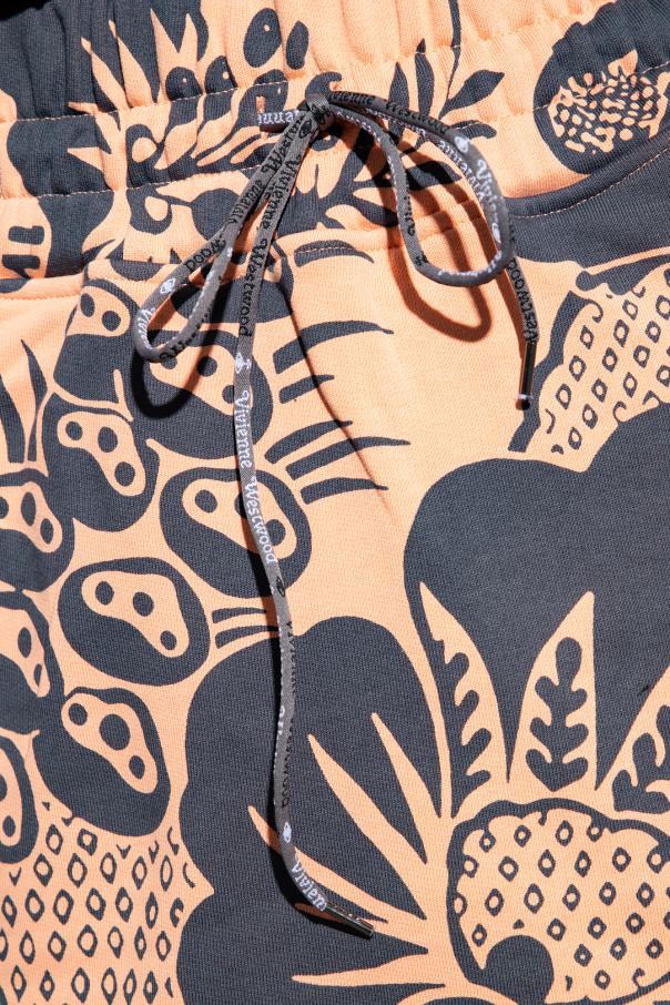 Orange and grey mini skirt from Vivienne Westwood. Made of organic cotton, this asymmetric design features an elastic drawstring waistband, floral motif, multicolored logo embroidery and two slip pockets.