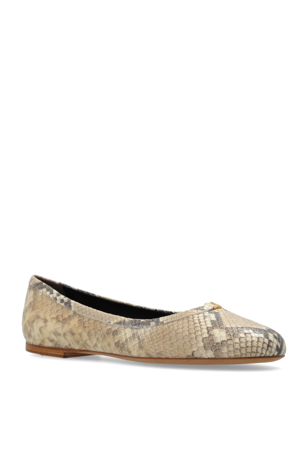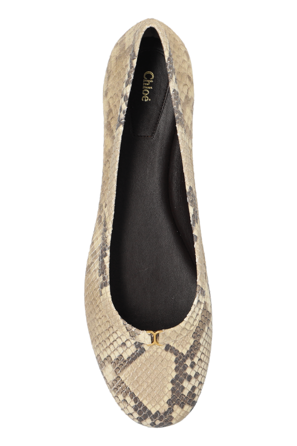 Introducing the epitome of refined elegance and distinctive style: the Chloé \'Marcie\' leather ballet flats. Crafted with meticulous attention to detail, these flats feature a classic, rounded front silhouette, ensuring timeless appeal and comfort for day-long wear. The flat heel underscores a commitment to both luxury and practicality, seamlessly blending form with function. The ballet flats boast an exquisite, multi-tonal snakeskin pattern, predominantly in shades of beige and brown, rendering them a versatile addition to any wardrobe. This enchanting design is further enhanced by a subtle, yet luxurious, golden embellishment near the tip, possibly representing the designer\'s logo or an exclusive ornamental feature. The juxtaposition of the dark interior, likely in black, against the lighter exterior pattern adds a layer of sophistication and allure. The inner part of the shoe proudly displays the golden Chloé logo, attesting to its authenticity and elite provenance. Constructed from the finest leather, both inside and out, including the sole, these ballet flats are not just footwear but a statement of unparalleled craftsmanship and elegance. Why Purchase This Product? Classic, rounded silhouette combined with a flat heel for ultimate comfort and style. Exotic, multi-tonal snakeskin pattern elevates any outfit with an air of luxury. Signature golden embellishment and Chloé logo serve as hallmarks of quality and exclusivity. Premium leather construction from the exterior to the sole for enduring beauty and durability.