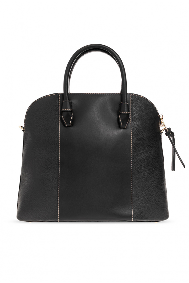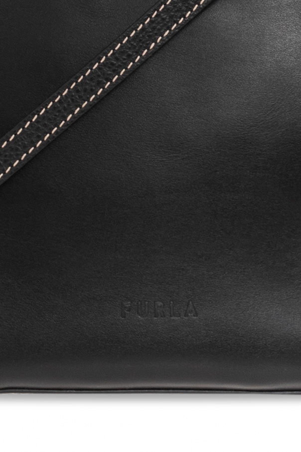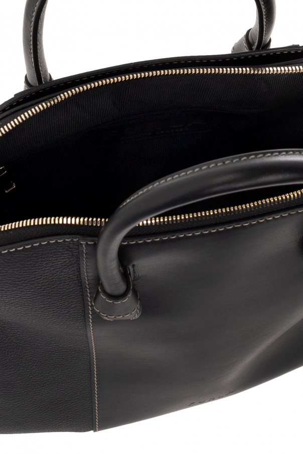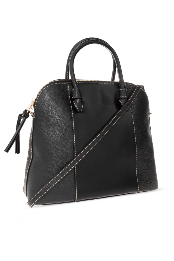 Black ‘Miastella Large’ handbag from Furla. Crafted from leather trimmed with beige threads, this design secures with a two-way zip and features an embossed logo on the front, two half-round handles, a detachable and adjustable shoulder strap, gold-tone metal hardware and one internal compartment with two slip pockets and one zip pocket.