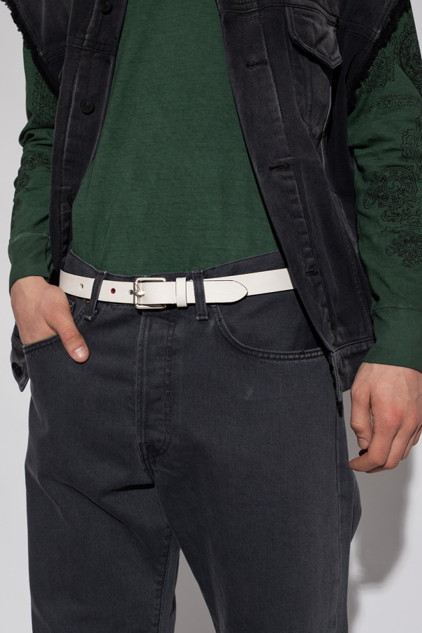 Cream belt from Diesel. Made of leather, this item features a cut-out logo pattern and metal buckle in silver-tone.
