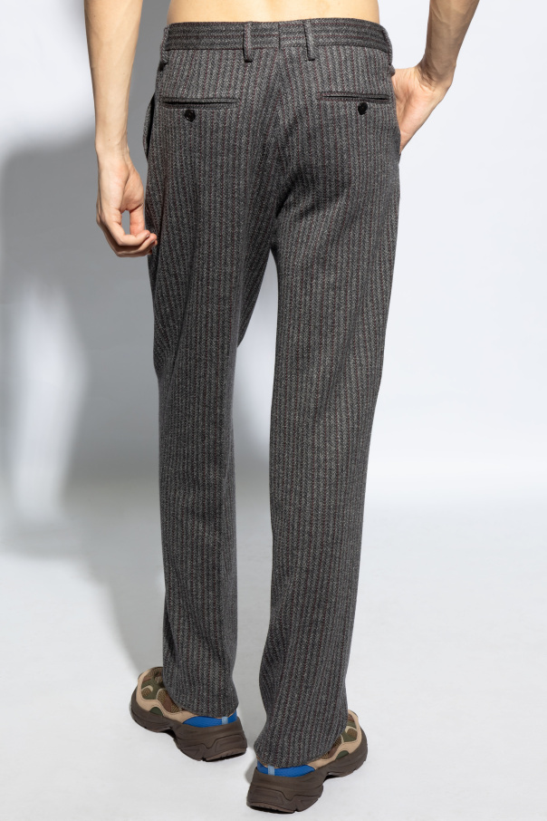Introducing the quintessence of modern elegance and comfort: Etro\'s Striped Trousers. Crafted with a discerning eye for detail, these trousers are a testament to the sophisticated blend of traditional and contemporary design. The fabric, a luxurious amalgamation of wool, cotton, and polyester, offers a texture reminiscent of classic woolen materials, ensuring both warmth and breathability. The trousers boast a classic fit, accentuated by vertical stripes in shades of gray and burgundy, ingeniously designed to elongate and slim the silhouette. This pattern, combined with the trousers\' structured waistband, replete with belt loops, allows for versatile styling options. Closure is achieved through a contemporary zip, hook, and button system, reinforcing the garment\'s seamless blend of functionality and style. Moreover, the inclusion of buttoned, welt back pockets adds a touch of elegance while maintaining practicality. The attention to detail is further exemplified by the dark, color-coordinated button, ensuring stylistic coherence and adding an understated yet distinctive touch to the overall design. Why Purchase This Product? Exquisite material blend offering comfort and durability Elegant stripe pattern that visually slims and elongates the figure Classic design with modern closures for a secure and stylish fit Functional features, including belt loops and buttoned back pockets, for added utility Impeccable craftsmanship from renowned designer Etro, ensuring quality and sophistication