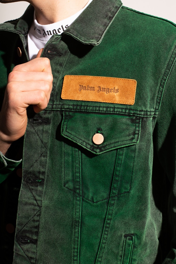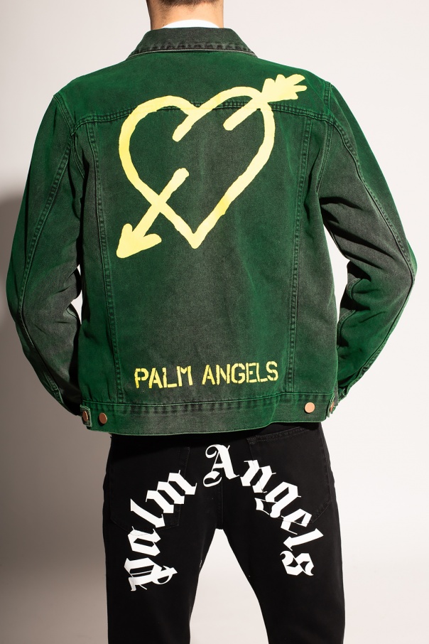 Green and black denim jacket from Palm Angels. Illustrated with a yellow graphic print with the brand\'s logo, this item features button fastenings, two welt pockets and two flapped button pockets.