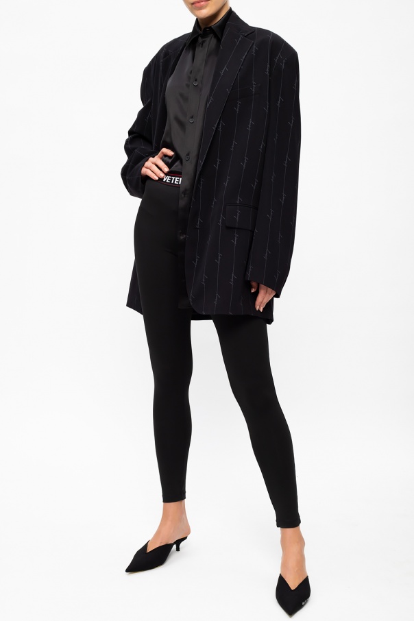 Black leggings from VETEMENTS. Woven from stretchy fabric, this pair is complete with an elasticated black waistband wielding white and red logo embroidery.