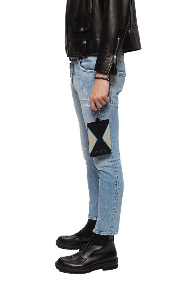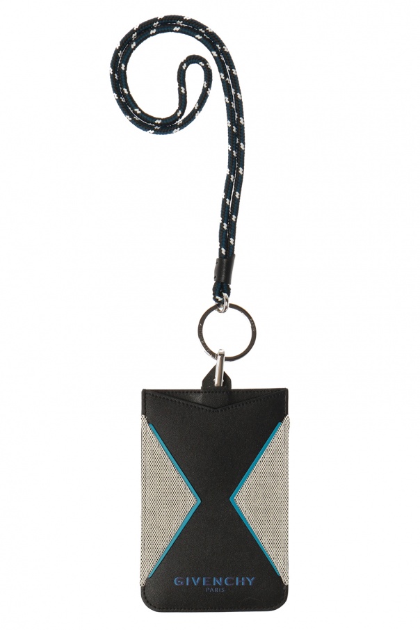 Black, white and blue iPhone case from Givenchy embellished with printed logo and attached charm.