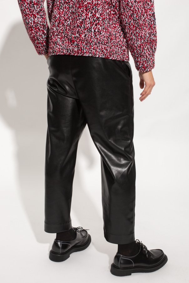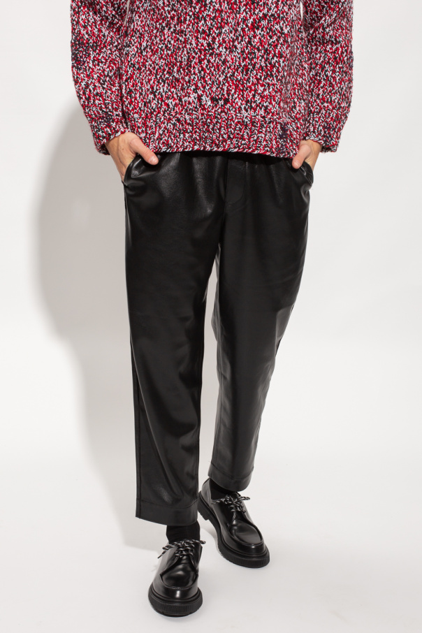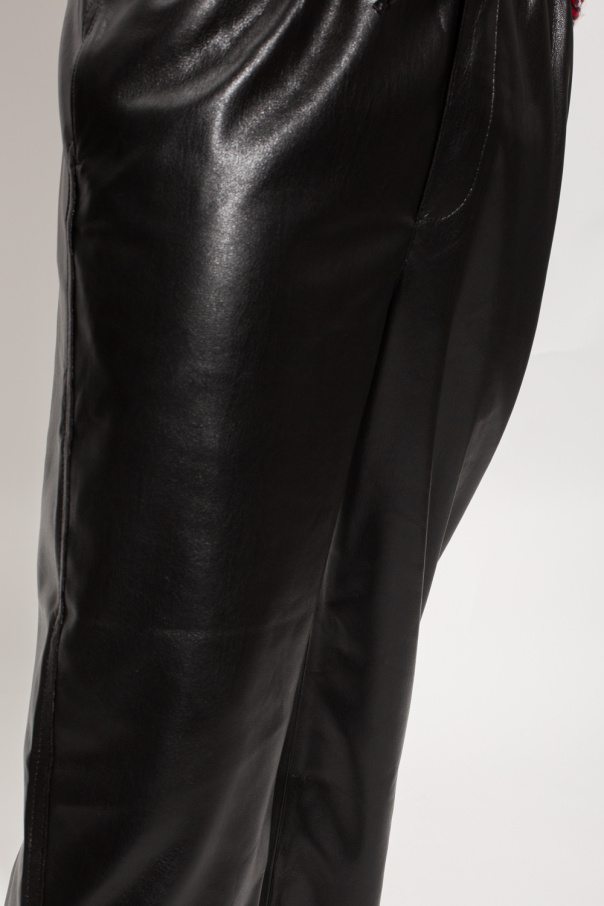 Black ‘Jain’ trousers from Nanushka. Made of vegan leather with a loose-fitting silhouette, this pair features a drawstring waist, button closures and four slip pockets.