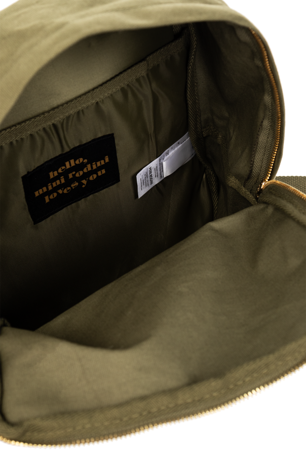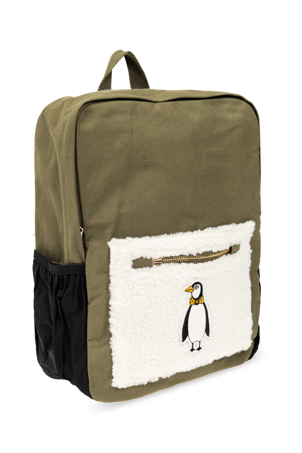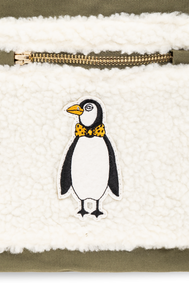 Khaki and black backpack from Mini Rodini. Crafted from organic cotton, this design fastens via a two-way zip and showcases a white faux-fur front with a zip pocket and penguin patch. It is complete with a half-round handle, side slip pockets, adjustable shoulder straps, gold-tone metal hardware and one internal compartment with a zip pocket.