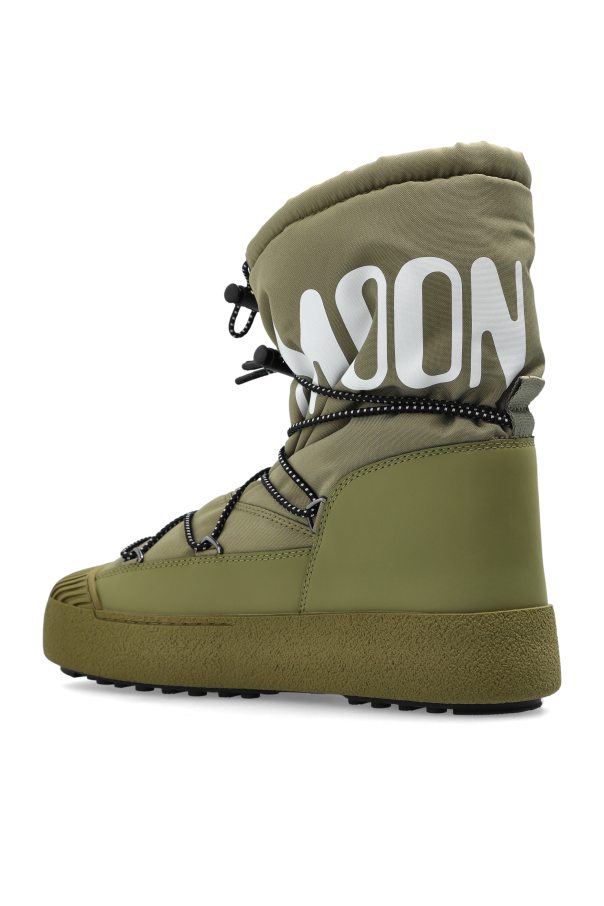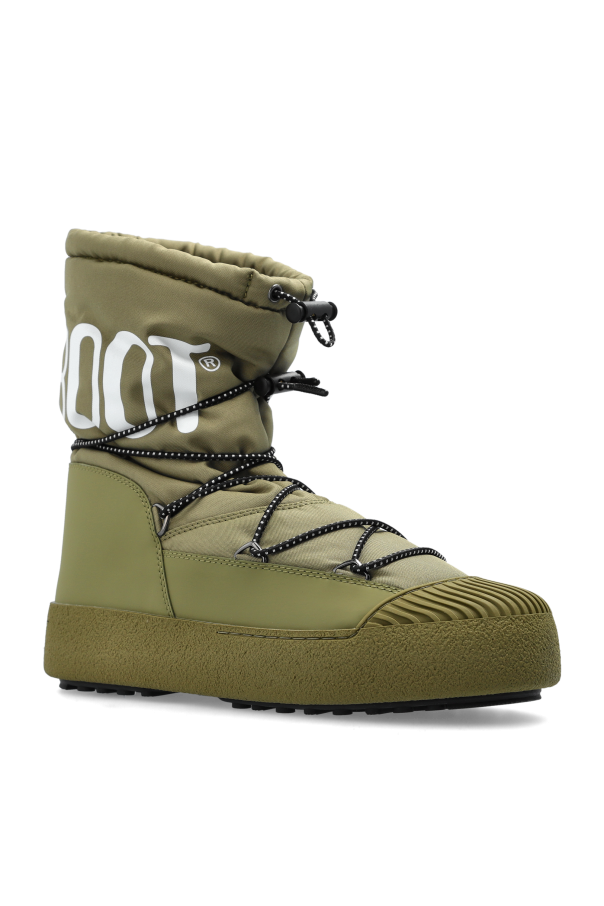 Introducing the MB MTRACK Polar Nylon snow boots, a testament to both style and functionality from the illustrious Moon Boot collection. Rendered in a striking green hue, these boots are crafted from resilient nylon, emphasizing their robust resistance to moisture and cold. Adorned with a distinctive white \"MOON BOOT\" logo, these boots feature an innovative quick-lace system with elastic cords for a secure fit. The high silhouette and thick sole offer superb thermal insulation, while the reinforced front and sturdy rubber sole ensure unparalleled grip and durability on snow-laden terrains. Rooted in the visionary designs of Giancarlo Zanatta from the \'70s, these boots have evolved to capture the hearts of winter enthusiasts. Perfect for those who seek both aesthetic appeal and practical protection against harsh weather. Why choose this product? Exclusive design with a bold green color. Durable nylon construction for moisture resistance. Quick-lace system for convenience and style. Reinforced front for enhanced protection. Thick sole for superior thermal insulation and grip.