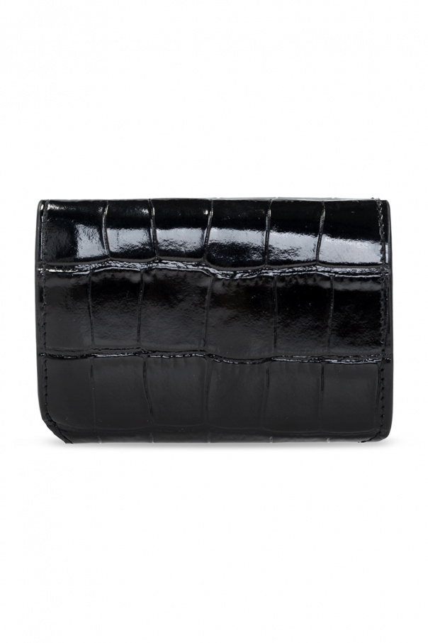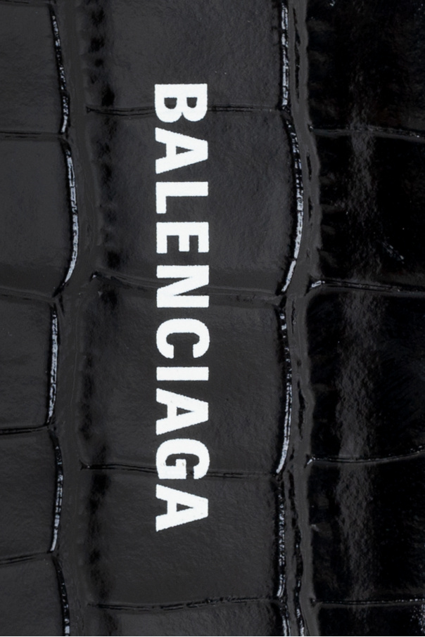 Black folding wallet from Balenciaga. Crafted from leather with a crocodile skin effect, this item fastens via a snap and features a white logo print on the front and a bill compartment, one snap-fastened coin pocket and three card slots inside.
