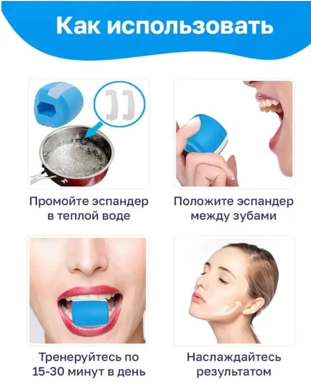 помогает укреплять лицевые мышцы и возвращает молодость!Челюстной тренажер отлично подойдет для формирования рельефа мышц нижней трети