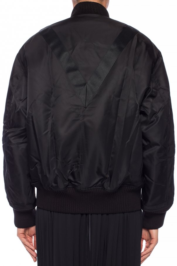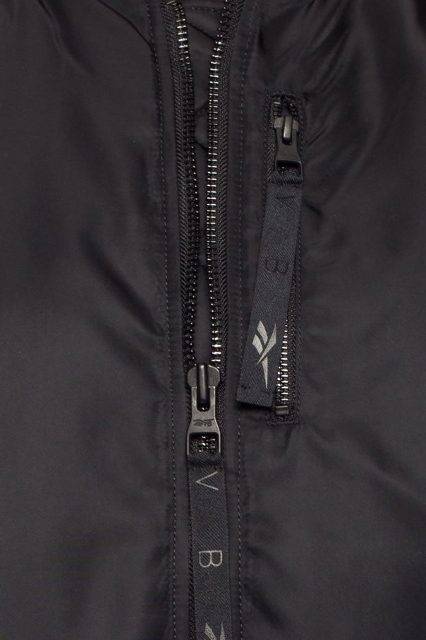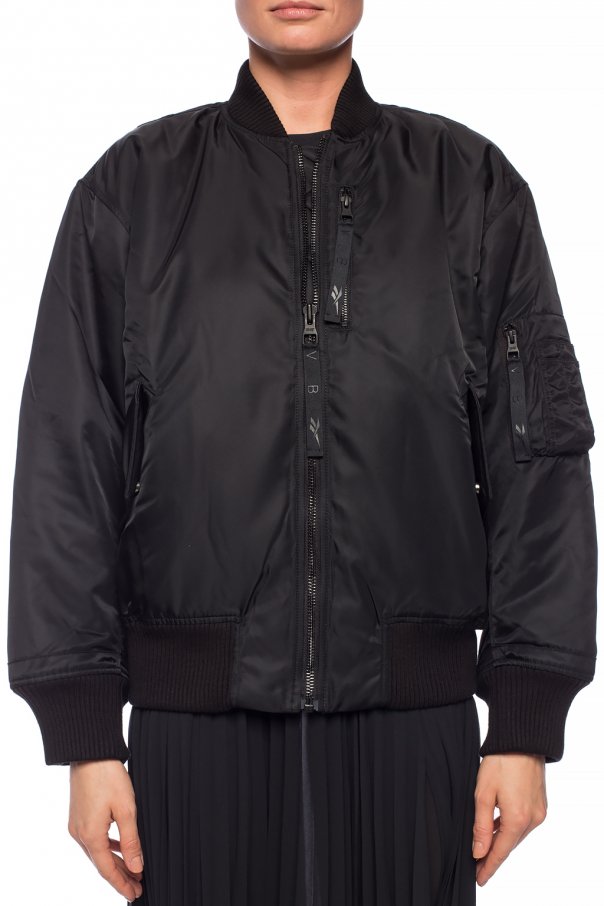 Black bomber jacket from Reebok x Victoria Beckham. Zip fastening. Decorated with a patch and logo stripes. Two snap pockets on the front. Elasticized bottom hem and cuffs.