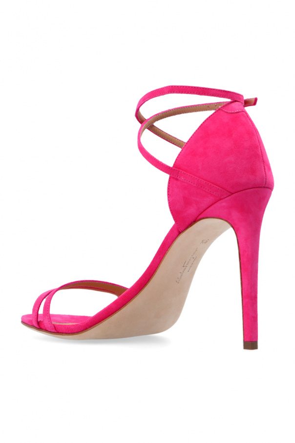 Pink ‘Ines’ heeled sandals from Salvatore Ferragamo. Made of calf suede, this pair features a buckled ankle strap and beige leather sole.