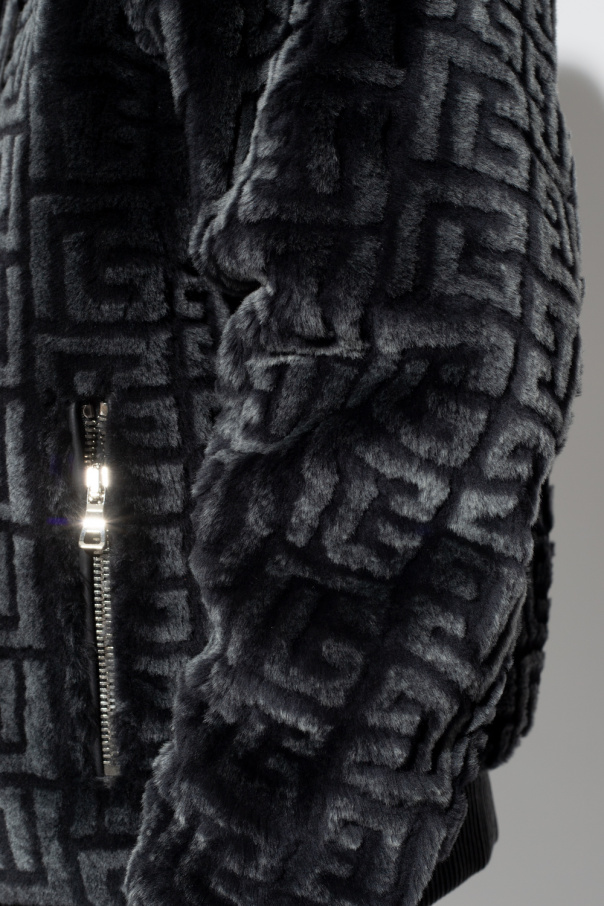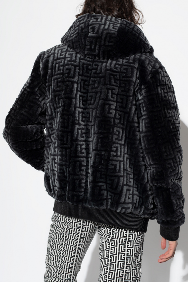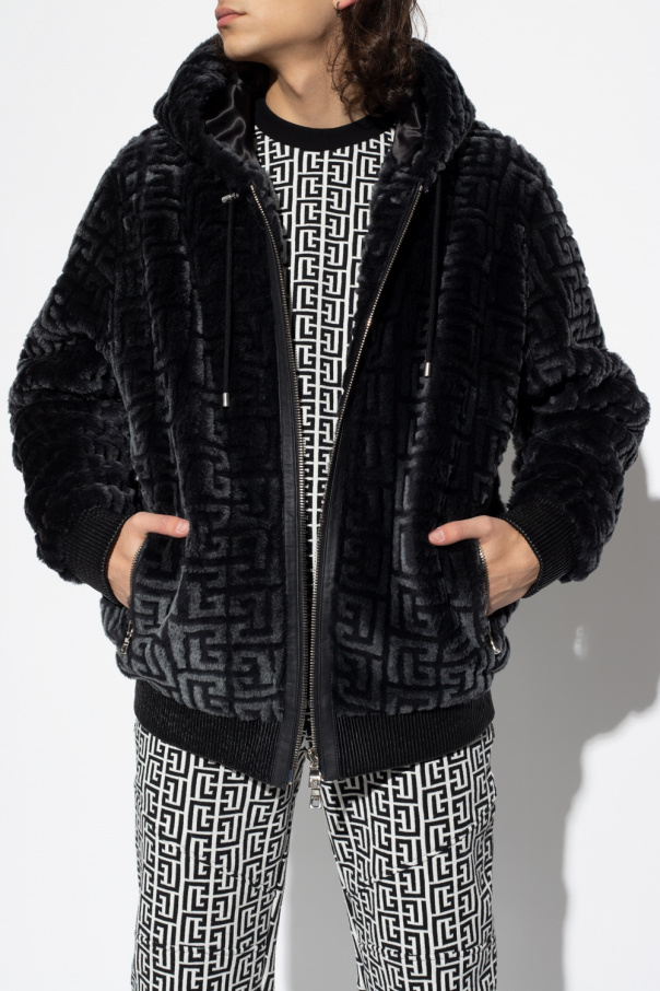 Black jacket from Balmain. Crafted from lamb fur, this style fastens via a two-way zipper and showcases a logo pattern. It is complete with a drawcord-adjustable hood, two zipped pockets and elasticized trims on the bottom hem and cuffs.