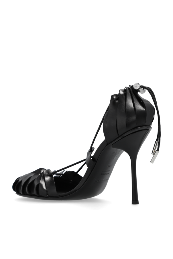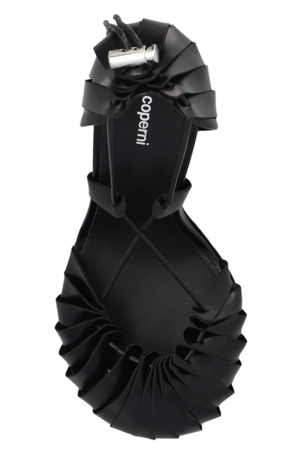 Black ‘Origami’ pumps from Coperni. Made from leather with a round toe, this model sits on a black leather sole and features back toggle details and a fan-like front.