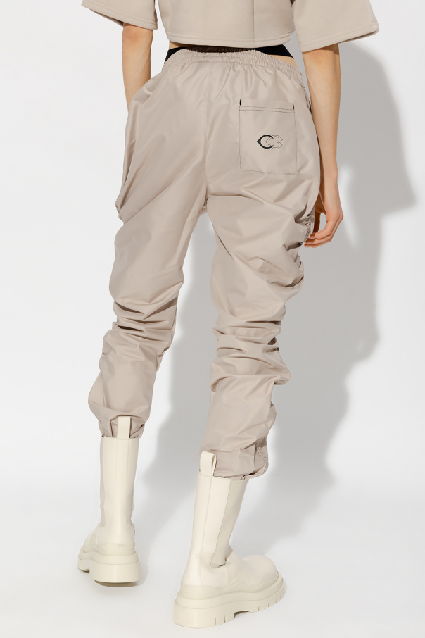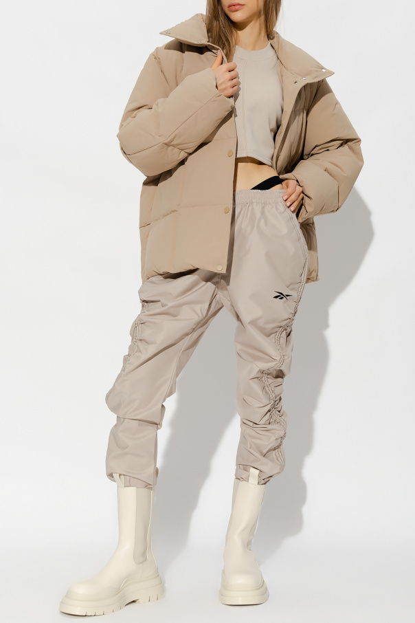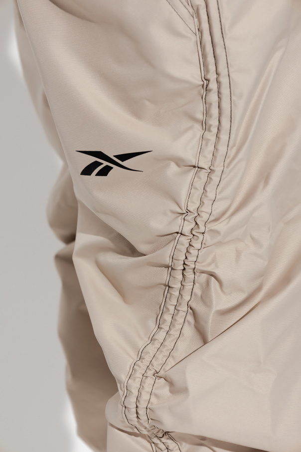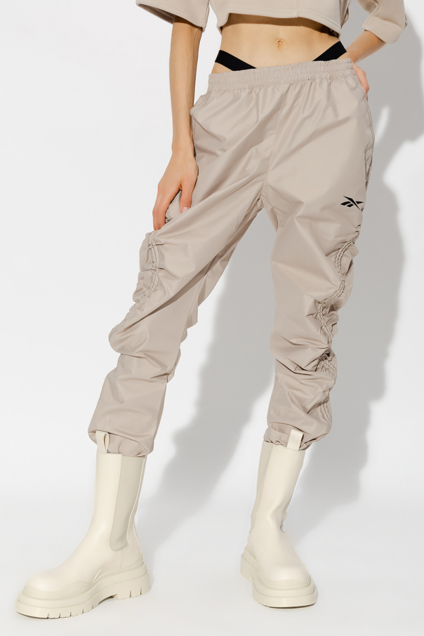 Beige sweatpants from Reebok x Cardi B. Crafted from recycled material, this pair features an elasticated waistband and elasticized bands, two slip pockets and a rubberised logo print on the front, one back pocket accentuated with a black print, and elasticated cuffs with drawstring details.