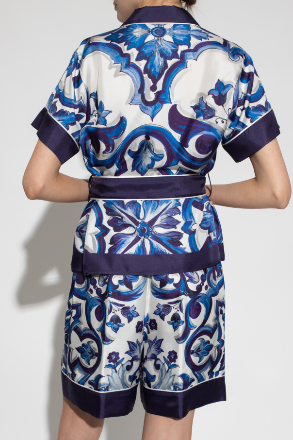 Blue, white and navy blue shirt with short sleeves from Dolce & Gabbana, the ‘Blu Mediterraneo’ collection. Made from silk twill decorated with a Mediterranean floral print inspired by majolica tiles, this style features button fastenings, a waist-cinching navy blue belt and a slip chest pocket.