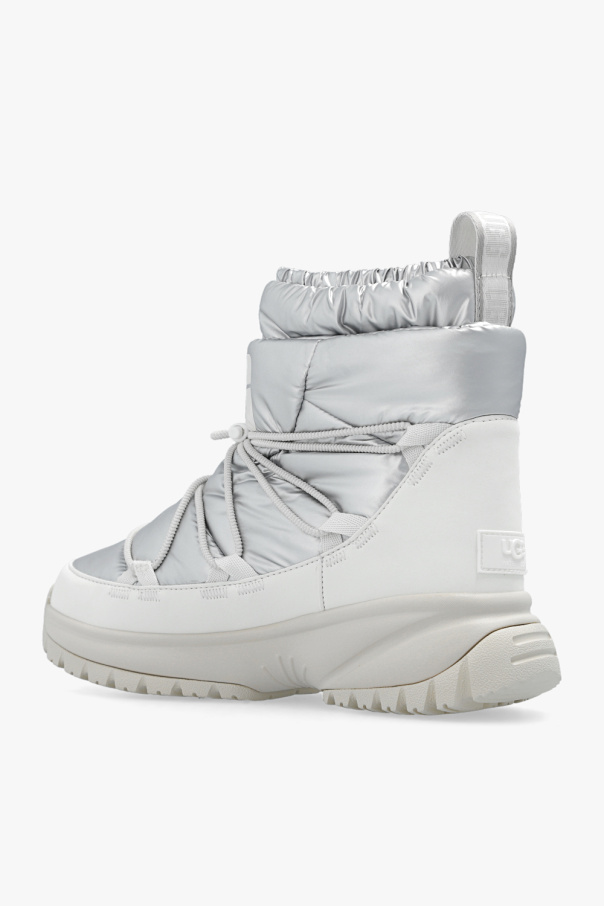 Silver-tone and cream ‘Yose Puff’ snow boots from UGG. Made of waterproof materials, this slip-on pair features drawstrings, logo print, UGGplush™ insole, Treadlite midsole, 200g insulation, DryTech technology and light beige rubber sole. Protects against weather conditions for temperatures as low as -32°C.