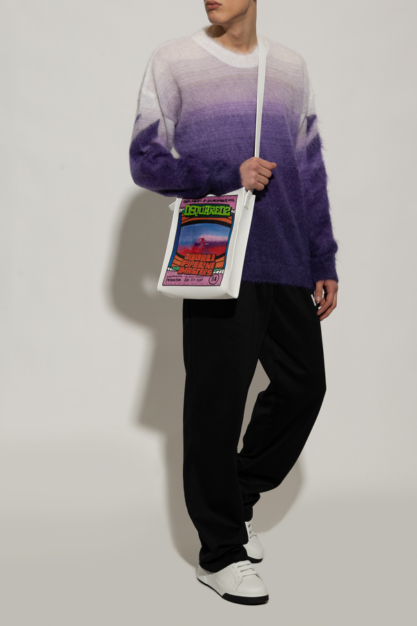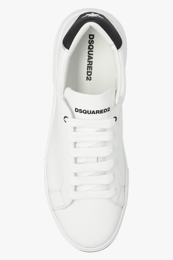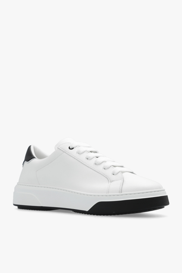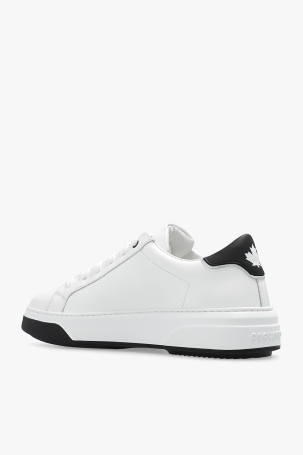 White and black ‘Bumper’ sneakers from Dsquared2. Made of calf leather, this lace-up pair features a logo-printed tongue, the brand's signature maple leaf detail at the back and black rubber sole.