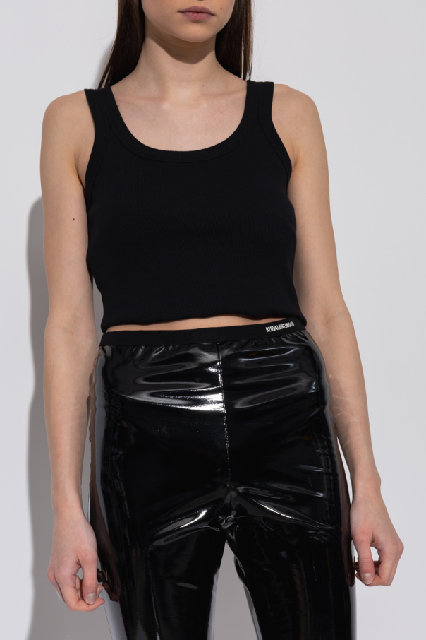 Black tank top from Red Valentino. Crafted from ribbed cotton, this design features cut-outs with a bow, rubber logo patch and ribbed crew neck.