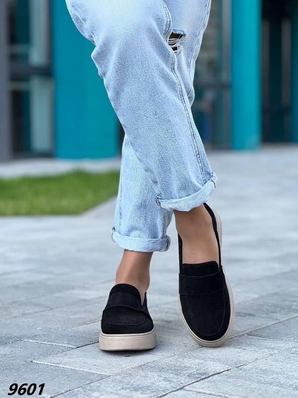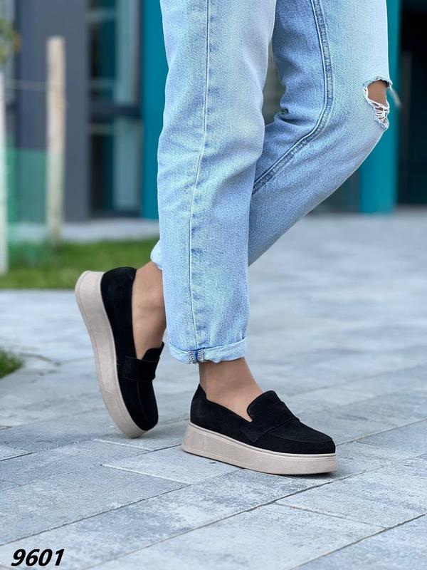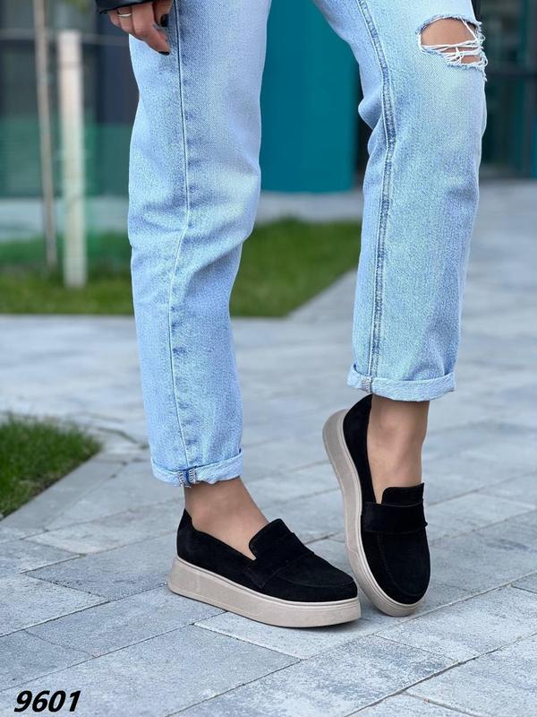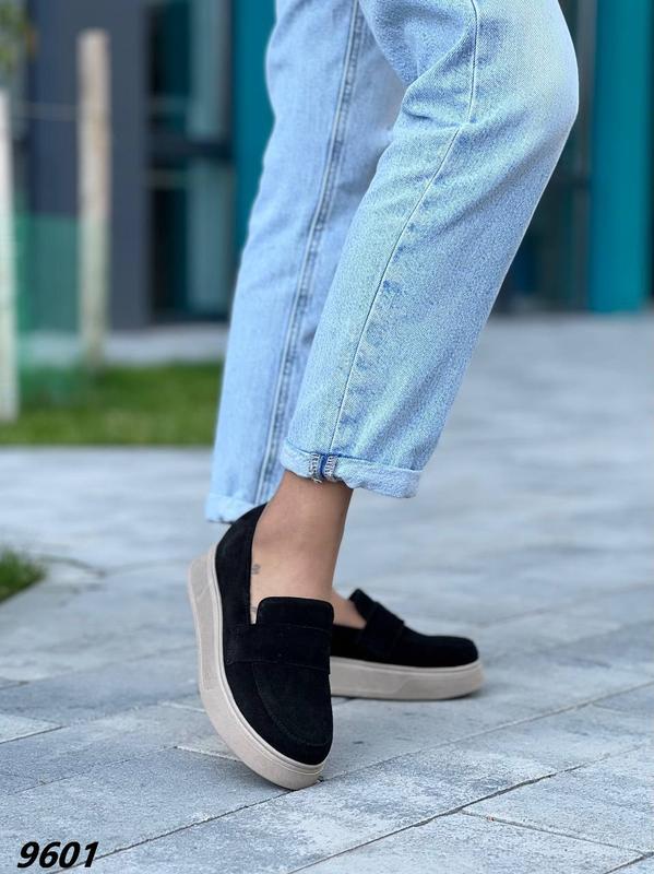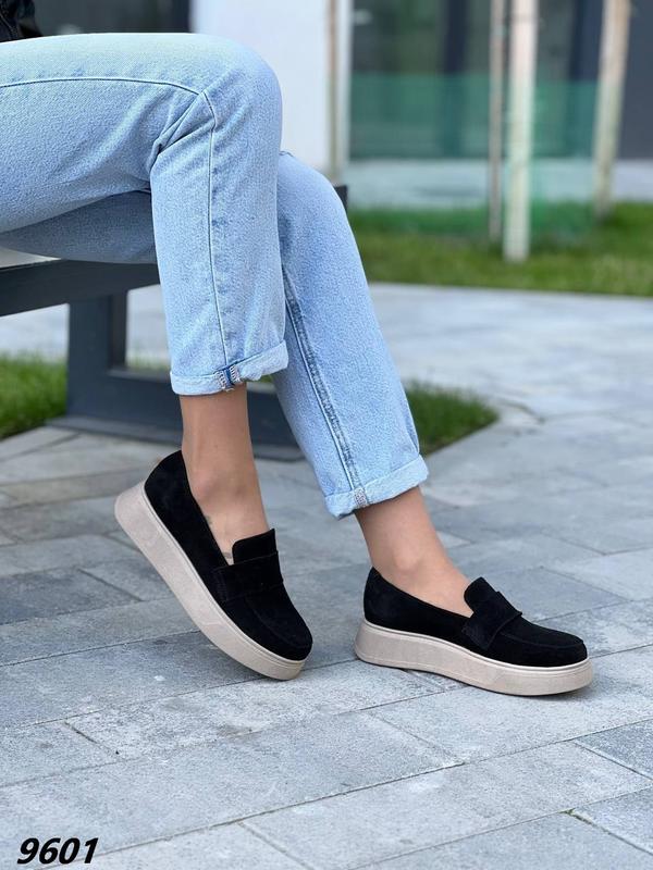 Лоферы Материал натуральная замша Цвет черный Высота обуви от пятки 5,5 см Высота подошвы 4 см впереди 2,5 смРазмер по сетке: