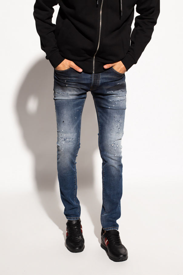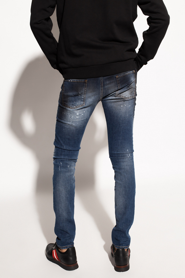 Navy blue jeans from John Richmond. Crafted from cotton with a faded-effect, this pair falls down with slightly tapered legs and features button fastenings, classic five pockets and a black patch with an embossed logo on the back.