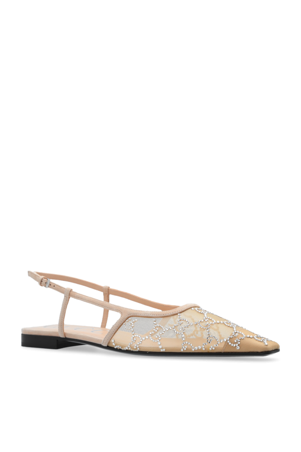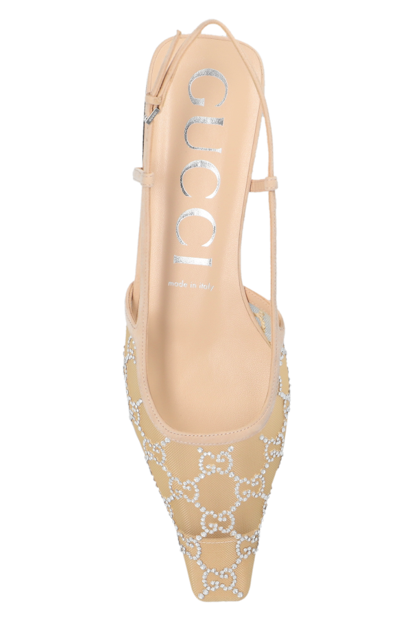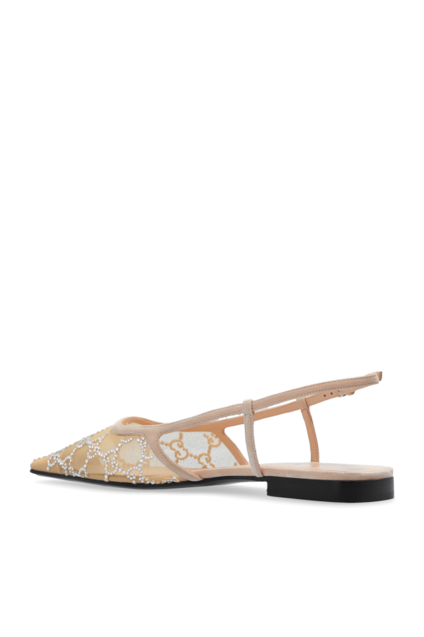 Beige ballet flats from Gucci. Rendered in mesh with an open heel, this model sits on a black leather sole and showcases a monogram pattern spruced up with sparkling crystals, an elongated square toe and an adjustable buckle strap on the back.