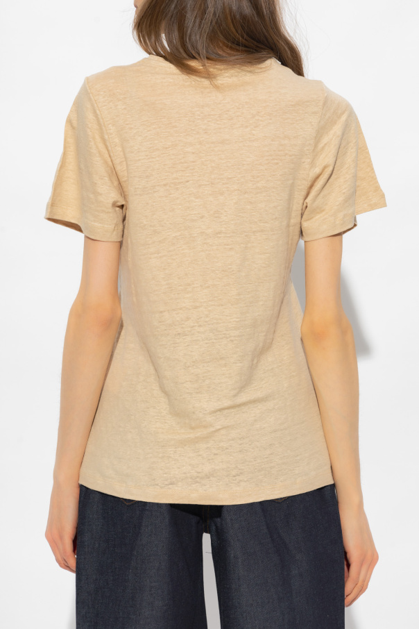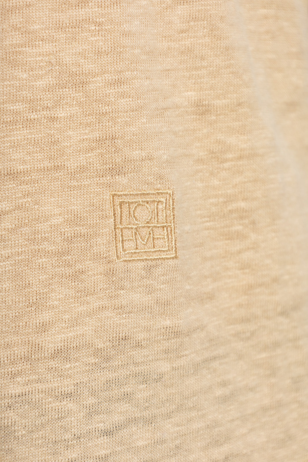 Beige crewneck T-shirt from Toteme. Made of linen, this style features an embroidered logo on the chest, short sleeves and ribbing on the collar.