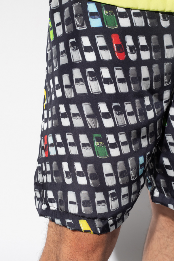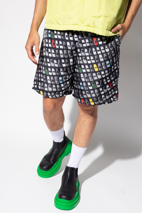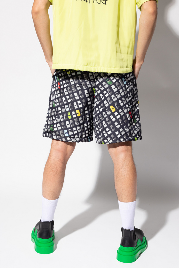 Navy shorts from Bottega Veneta. Fastened with a zip fly and button, this pair features a multicolored print, two front pockets and two buttoned back pockets.