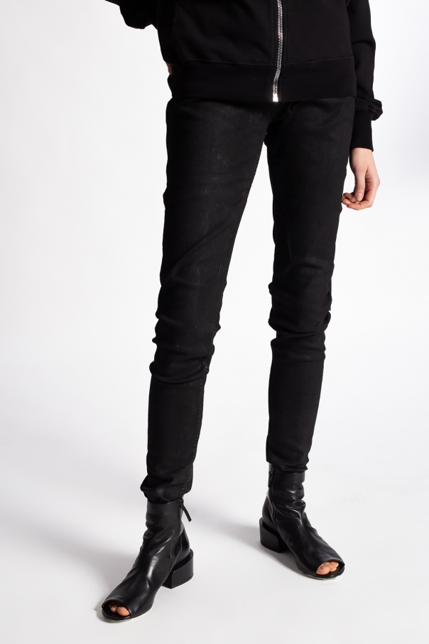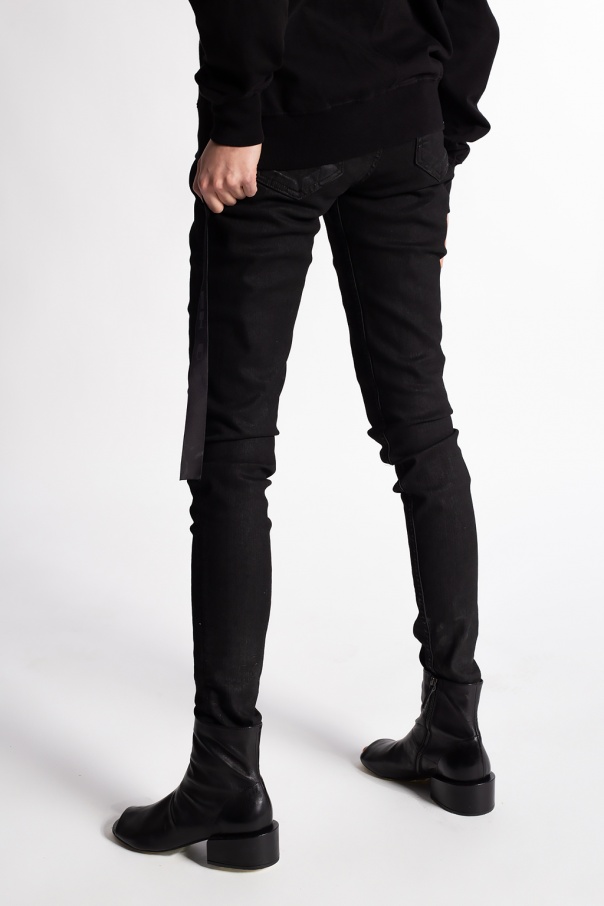 Black jeans from Rick Owens DRKSHDW. Falling down with tapered legs, this pair features a zip fly, a single button and six slip pockets: four on the front and two at the back.