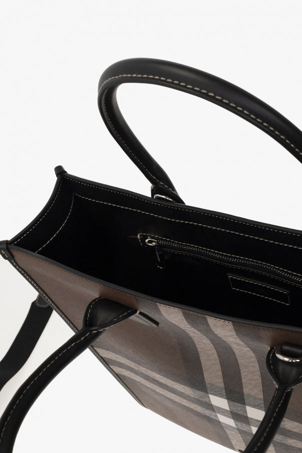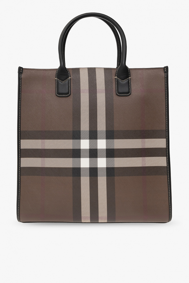 Brown shopper bag from Burberry. Crafted from canvas boasting the brand's signature colourful check pattern, this design features black leather trims, tactile branding on the front, a detachable and adjustable shoulder strap, silver-tone metal hardware and one internal compartment with one zip pocket and two slip pockets.