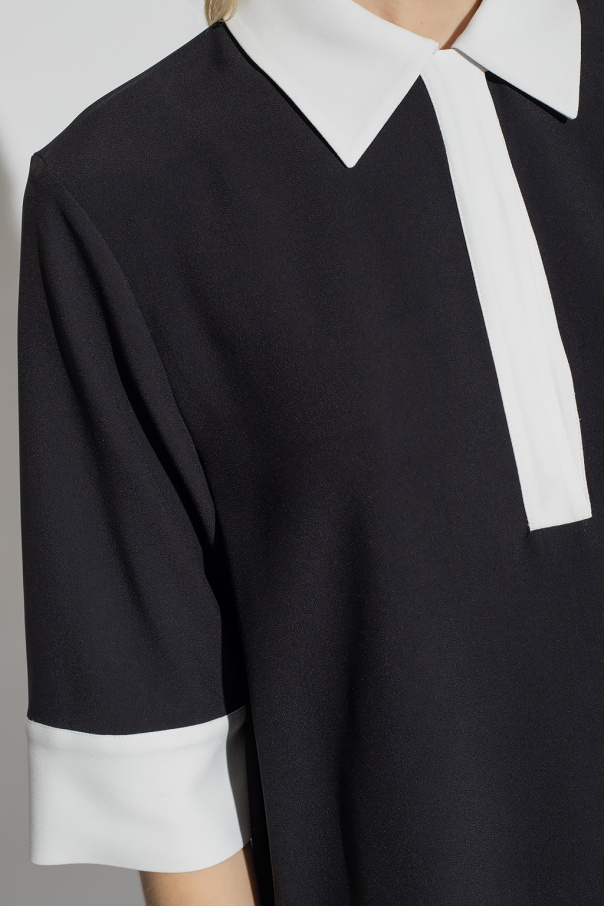 Black and white loose-fitting mini dress from Red Valentino. This design features a buttoned collar, short sleeves, two slip pockets and ruffled hem.