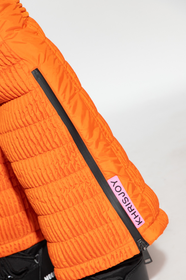 Orange quilted ski trousers from Khrisjoy. This high-waisted pair features a zip fastening, two zip pockets and flared legs with zips and rubber logo patch.