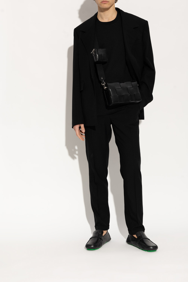 Black ‘Parakeet’ moccasins from Bottega Veneta. Made of leather, this pair rests on a dark green rubber sole.