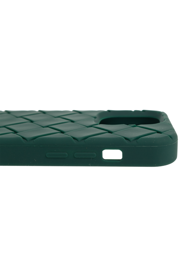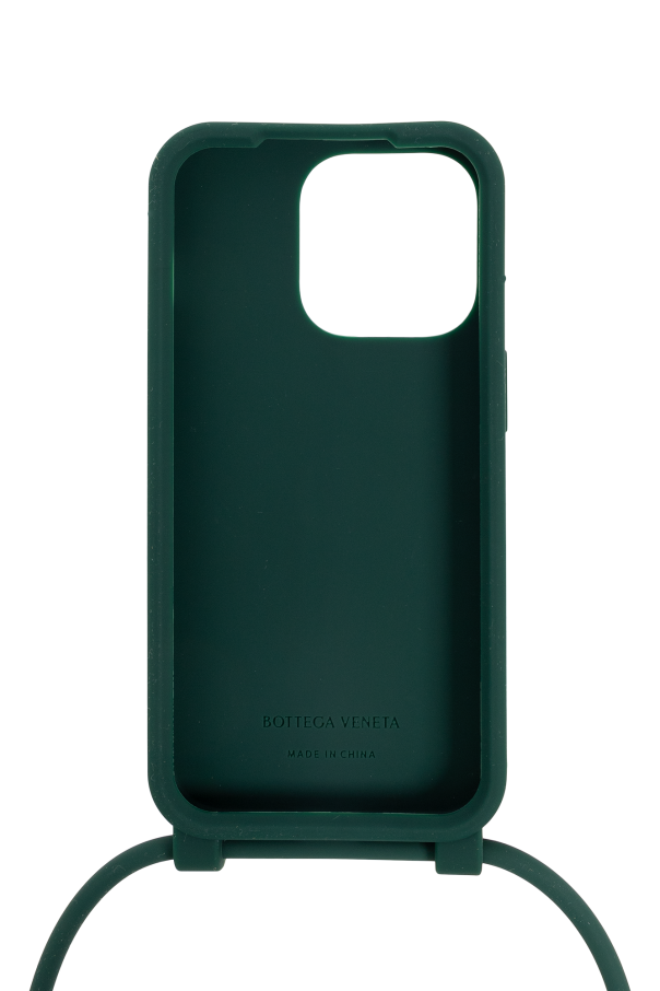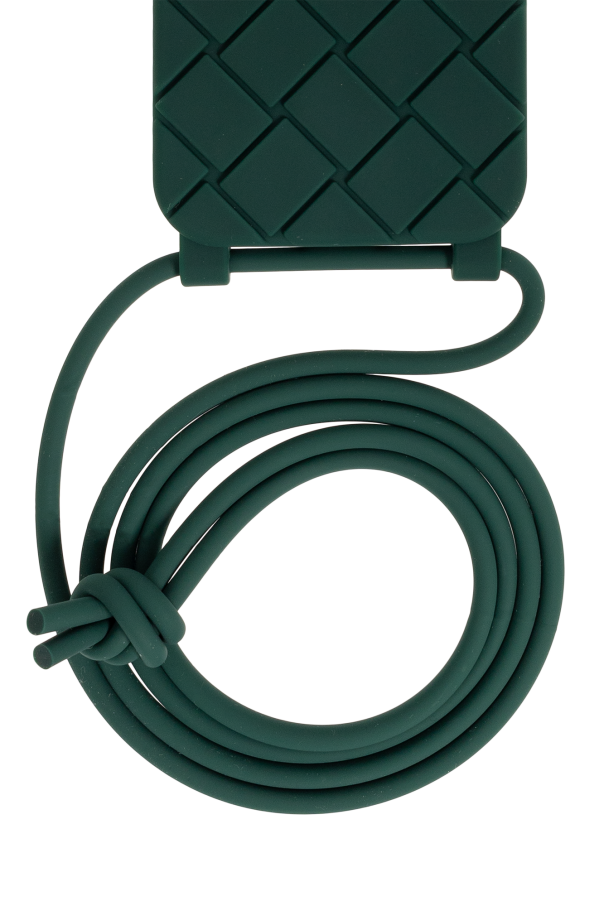 Dark green iPhone 14 Pro case with the iconic Intreccio motif and a strap from Bottega Veneta. Made of silicon.