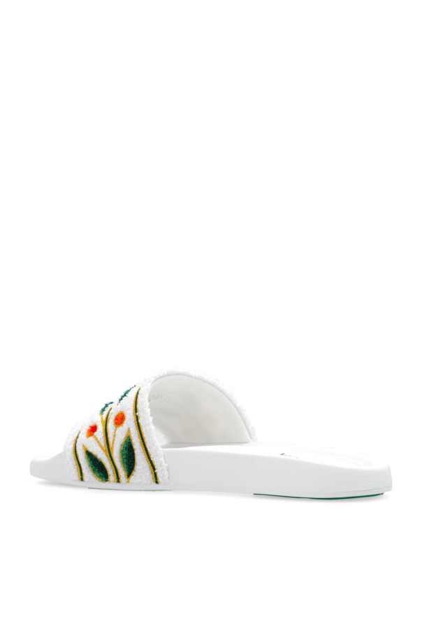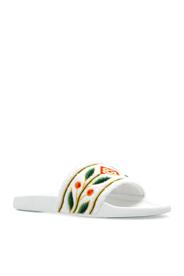 White slides from Casablanca. Made from terry fabric, this design features a multicolored laurel leaf and a rubber sole in white and green.