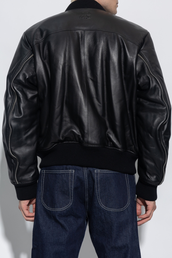 Black jacket from Off-White. Made of leather, this design is complete with a zip fastening, embossed logo, two zip pockets and ribbed trims at the stand collar, hem and cuffs.