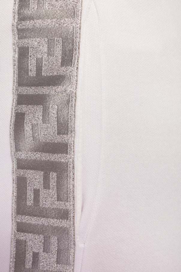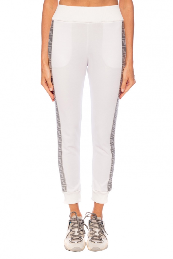 White sweatpants from Fendi. Elasticated waistband. Decorated with side stripes featuring a logo in silver-tone. Two slip pockets on the front. Elasticated cuffs.