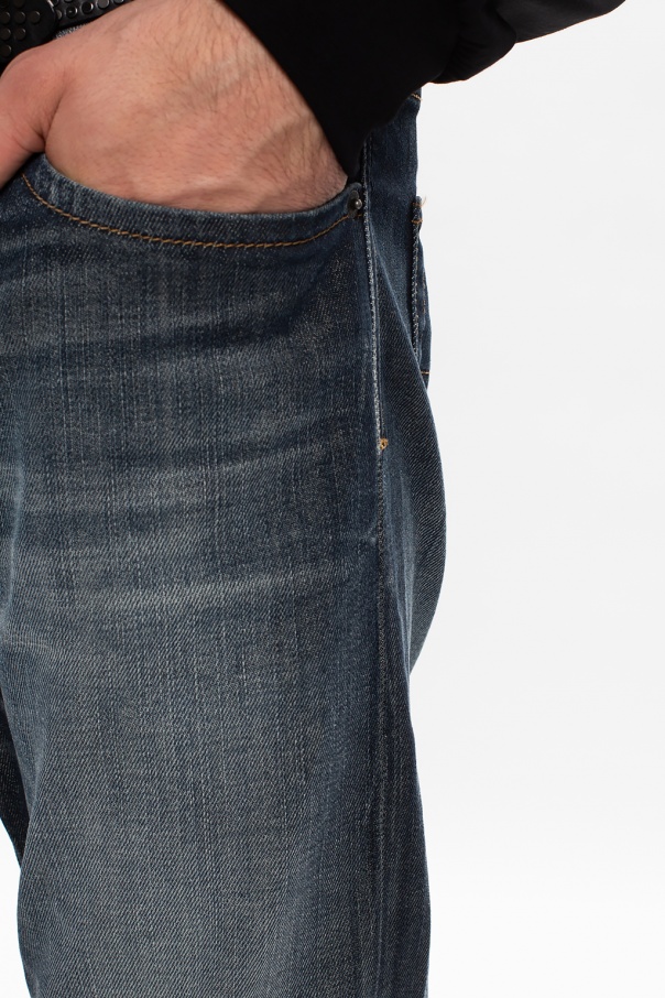 Navy blue ‘Larkee-X’ jeans from Diesel. Crafted from stretchy cotton denim, this pair falls down with straight legs and features a button fastening with a concealed placket and classic five pockets.
