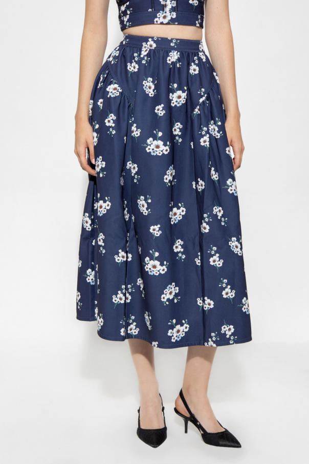 Navy blue midi skirt from Self Portrait. Embellished with a colourful floral pattern, this style features a high-rise waist, a back zipper and hook & eye closure, two slip pockets and a flared hem.
