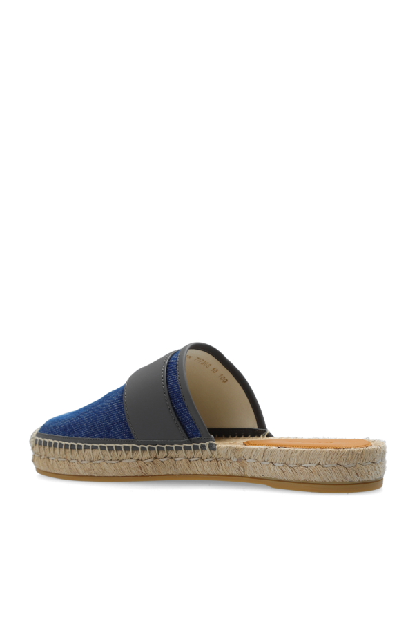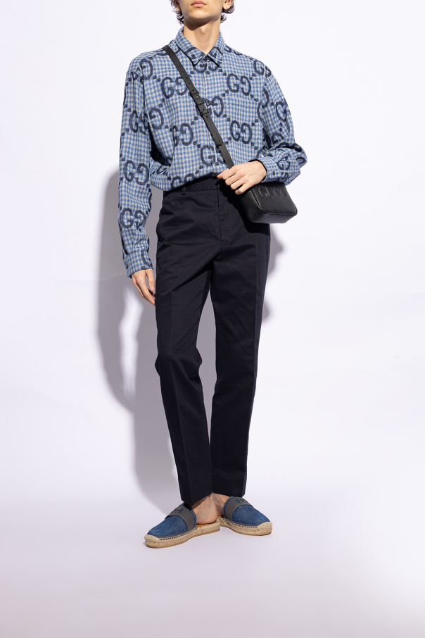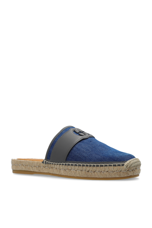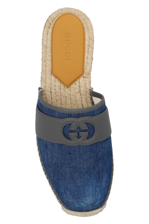 Blue and grey slides from Gucci. Made from denim and leather, this model sits on a beige rubber sole and showcases the brand\'s logo on the front.