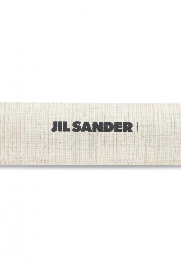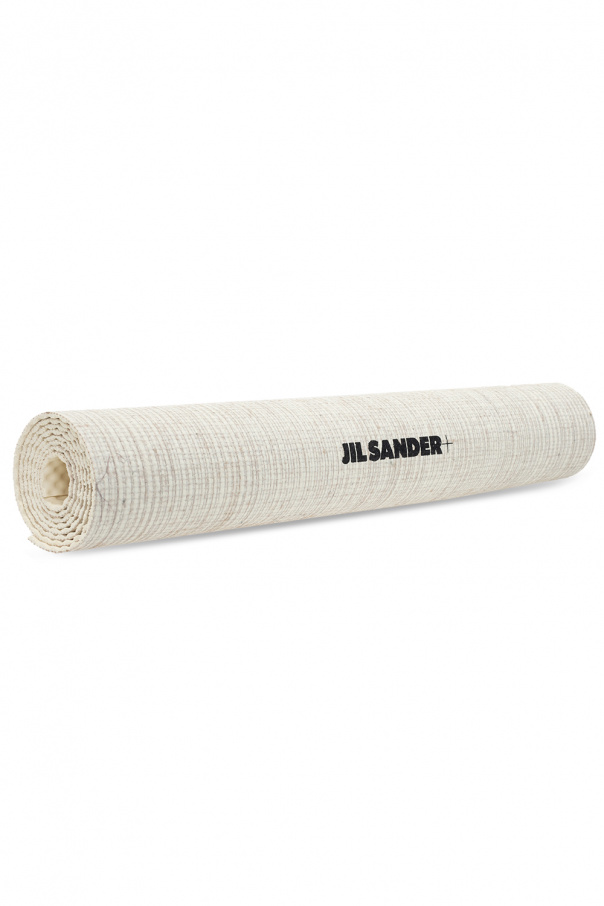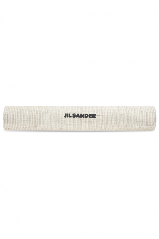 Beige plant-based yoga mat from Jil Sander+. It is decorated with a printed logo pattern in black and comes with a carry case.