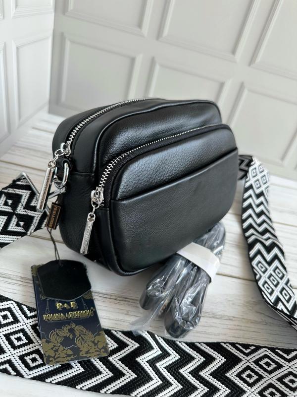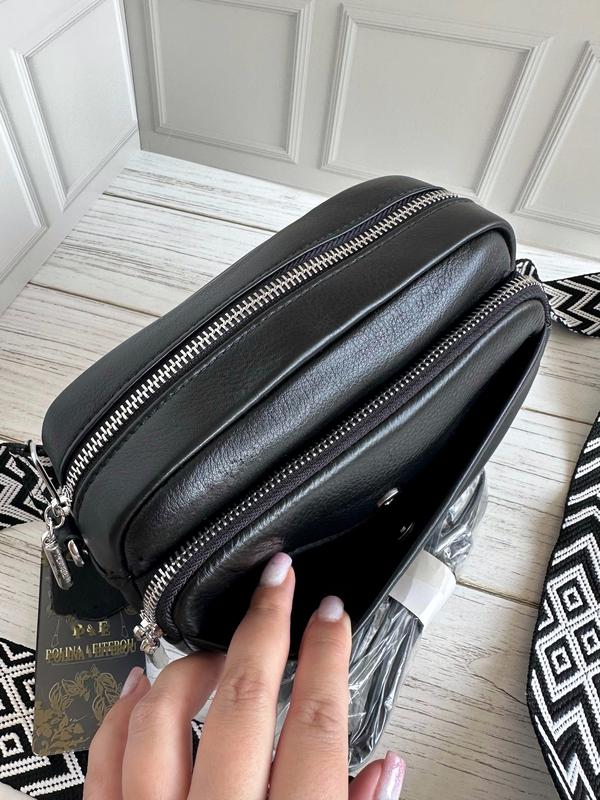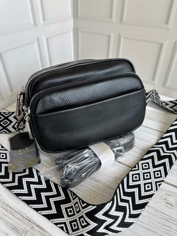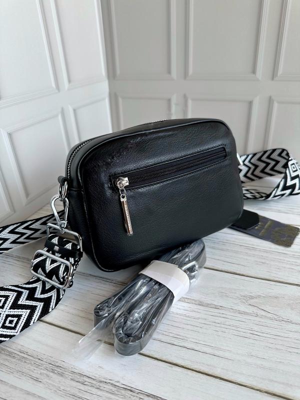 Стильная кожаная сумочка-кроссбоди, декорирована красивым текстильным ремнем.