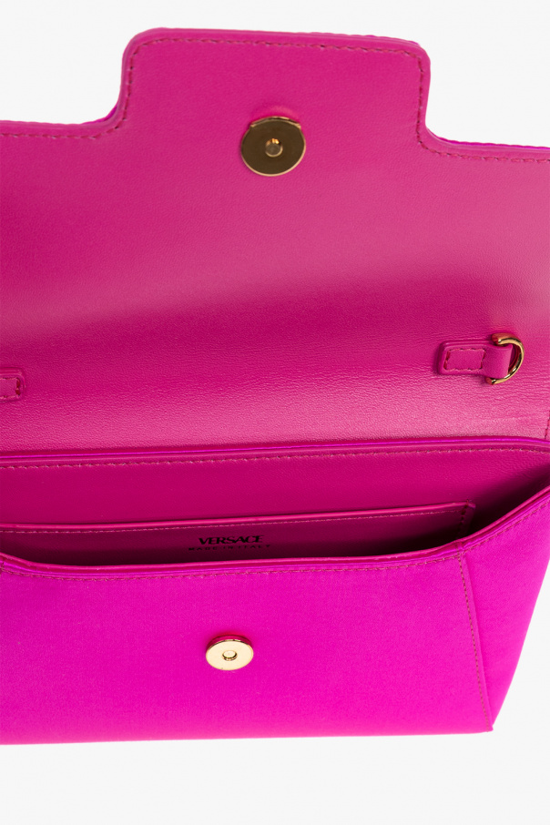 Neon pink ‘La Medusa’ clutch from Versace. Crafted from satin, this design secures with a magnetic snap and showcases the brand's signature Medusa and Greca hardware bejewelled with glossy crystals, a detachable chain strap, gold-tone metal hardware and a leather-clad interior with a slip pocket.