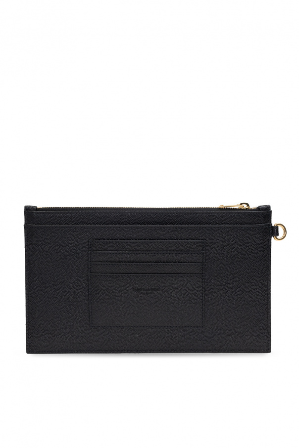 Black quilted clutch from Saint Laurent. Crafted from grainy calf leather, this design fastens via a zip and showcases metal interlaced YSL initials on the front, a slip pocket on the front, four card slots and one slip pocket on the back, a detachable wrist strap, gold-tone metal hardware and one internal compartment with a slip pocket.