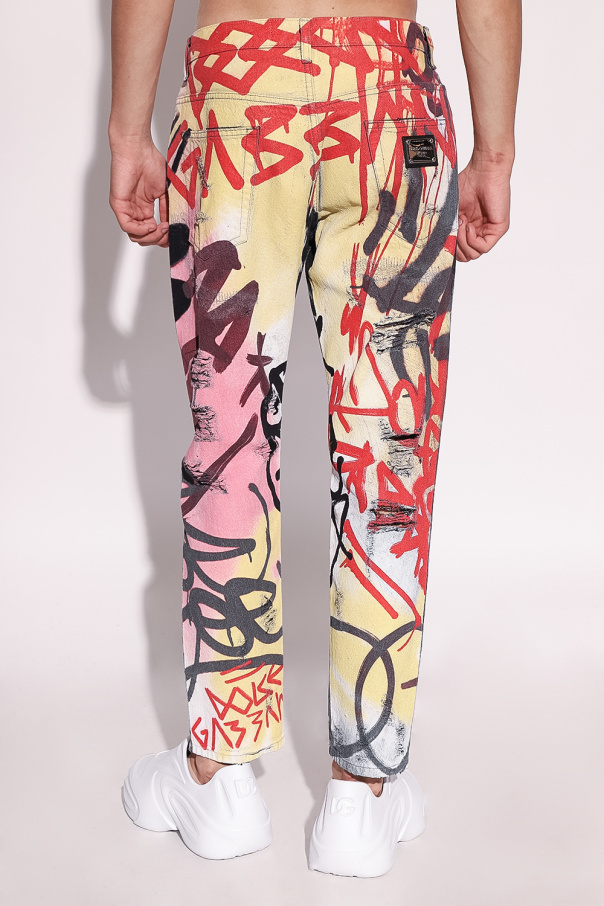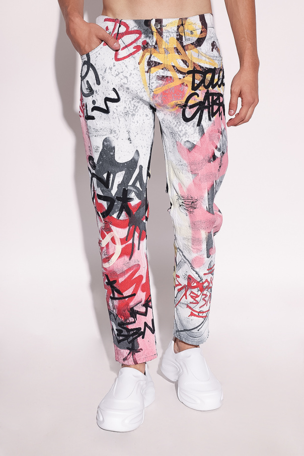 Multicolored distressed jeans from Dolce & Gabbana. Fastened with a zip and button, this pair falls down with slightly tapered legs and is complete with a graffiti print, three front pockets and two back pockets with a logo appliqué.