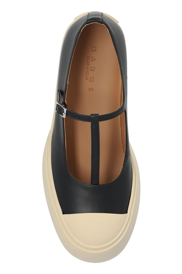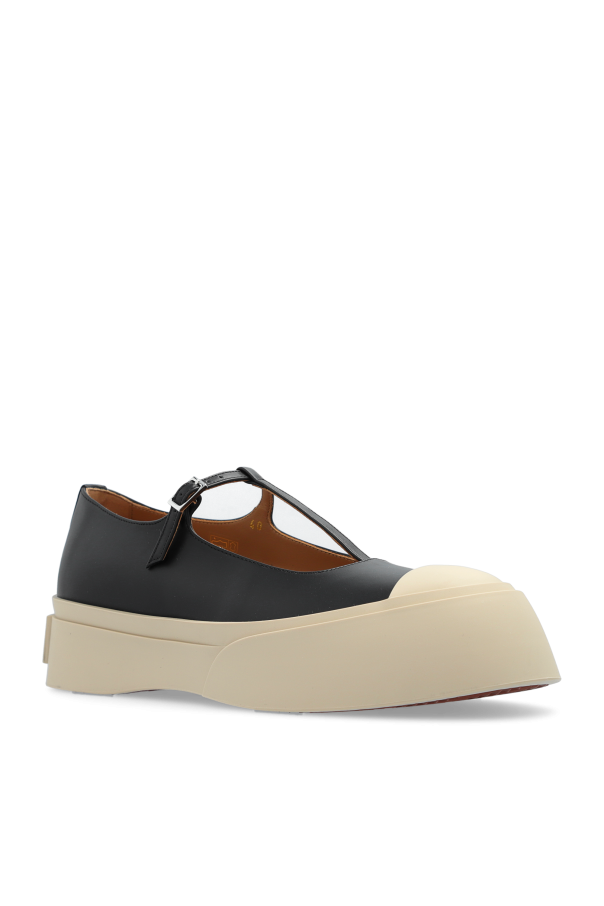 Introducing an exquisite embodiment of sophistication and timeless design: the ‘Mary Jane’ Leather Shoes by the esteemed designer, Marni. Crafted with meticulous attention to detail, these shoes are a testament to the luxury and innovation synonymous with the brand. Constructed from premium, glossy leather that exudes elegance, these shoes feature the iconic ‘Mary Jane’ silhouette with a modern twist. The adjustable strap across the top of the foot, secured with a sleek buckle, ensures a perfect fit, while the rounded toes offer a classic, refined look. The striking contrast of the black leather against the light, robust rubber sole not only adds a contemporary edge but also ensures durability and comfort. Notably, the sole is adorned with the designer’s logo, a subtle nod to the exclusivity of the piece. Why Purchase This Product? Exceptional quality and craftsmanship from high-grade leather and rubber materials. Adjustable strap provides customizable fit, enhancing comfort. Timeless design with a modern twist, suitable for a variety of occasions. Distinctive Marni branding for an added touch of luxury. Thick sole offers superior cushioning and longevity.