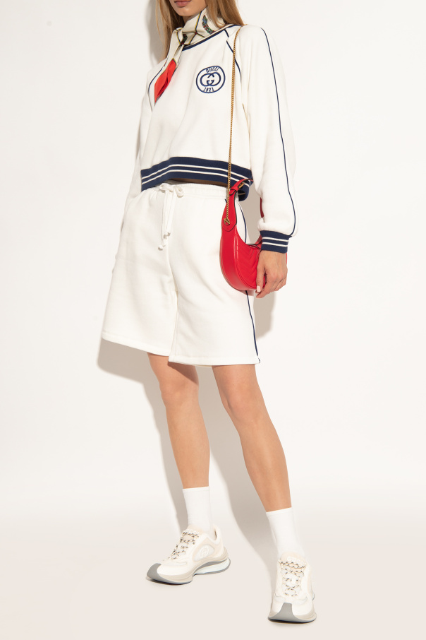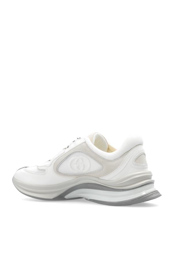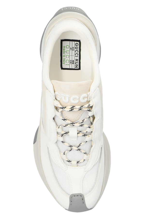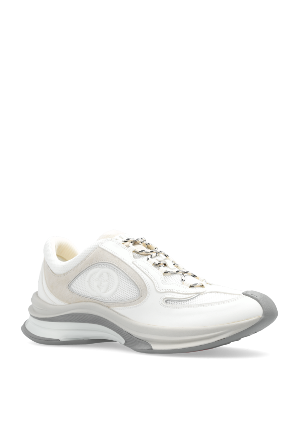 White, grey and cream ‘Run’ lace-up sneakers from Gucci. Made of leather and fabric, this design features an Interlocking G detail, suede trims and rubber sole in grey and red.