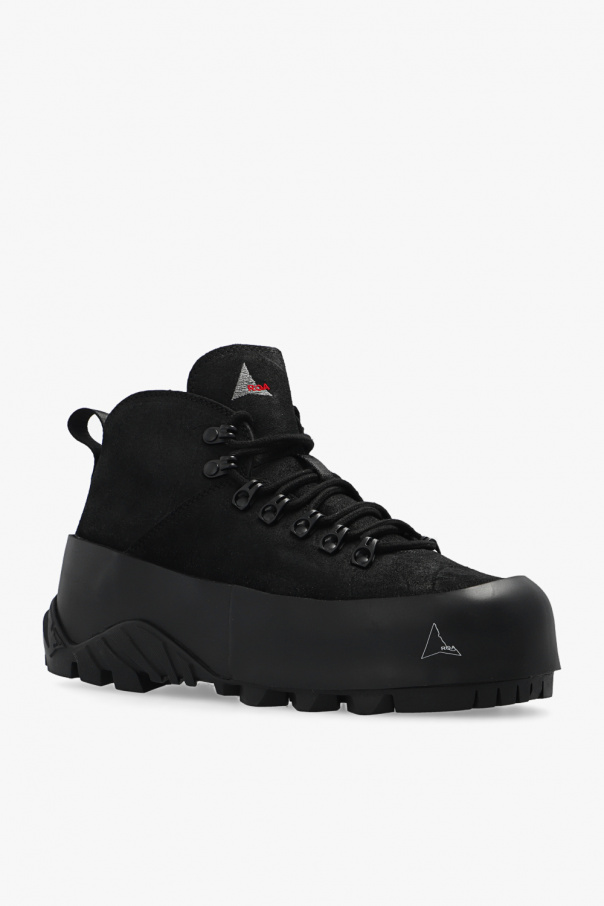 Black ‘CVO’ hiking boots from ROA. Crafted from leather with a vintage effect and trimmed with rubber, this lace-up model features a logo-embroidered tongue, a logo printed on the side, a pull tab at the back and a black Vibram Megagrip toothed tread pattern sole designed for optimal traction and to ensure high resistance to use on roughest surfaces. Swappable white laces included.